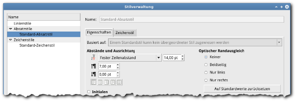 Du kannst diese Werte auch in das Grundlinienraster einstellen. Siehe: Datei – Dokumenteneinstellungen - Hilfslinien. Lege nun weitere Absatz- und Zeichenstile fest: